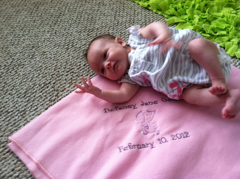 One of my Mom's sweet friends Sylvia made this blanket for Delaney. She was posing for the camera here ;) HA!!!